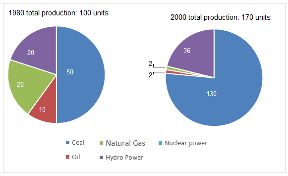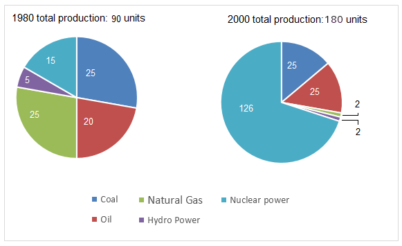 In the case of France, nuclear power became the most prominent source of electricity generation increasing from 15 units in 1980 to a high figure of 126 units by 2000. Similarly, a slight increase was seen in units of electricity generated using oil in 2000 (25) compared to 1980 (20). While the units of electricity generated by coal remained unchanged in both the years at 25 units, the figures of production by natural gas and hydro power which were 5 and 25 units respectively went down to 2 units each.
