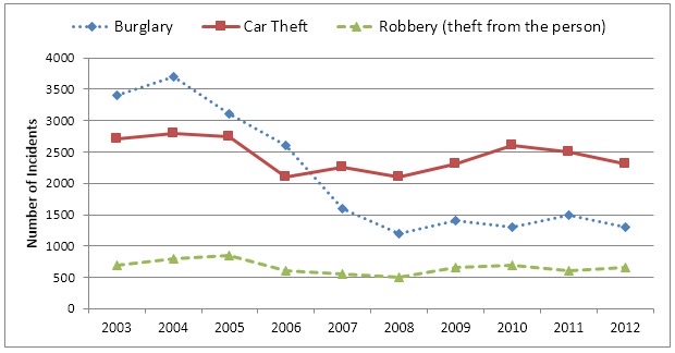 Similarly, car thefts followed a comparable trend to burglary, starting from around 2,800 cases in 2003 and decreasing until 2006. The number then rose to roughly 2,200 in 2007, followed by a minor decrease in the following year. However, from 2008, car thefts had a general upward trend until the end of the period.